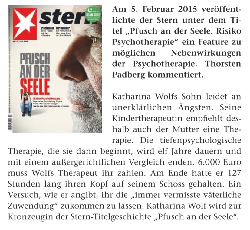 Katharina Wolfs Sohn hat unerklärliche Ängste. Die Kindertherapeutin empfiehlt deshalb auch der Mutter eine Therapie. Die tiefenpsychologische Therapie, die sie dann beginnt, wird elf Jahre dauern und mit einem außergerichtlichen Vergleich enden. 6000 Euro muss Wolfs Therapeut ihr zahlen. Zum Schluss hatte er 127 Stunden lang ihren Kopf auf seinem Schoss gehalten. Ein Versuch, wie er angibt, ihr die „immer vermisste väterliche Zuwendung“ zukommen zu lassen. Katharina Wolf wird zur Kronzeugin der Stern-Titelgeschichte „Pfusch an der Seele. Risiko Psychotherapie“ vom 05. Februar 2015.